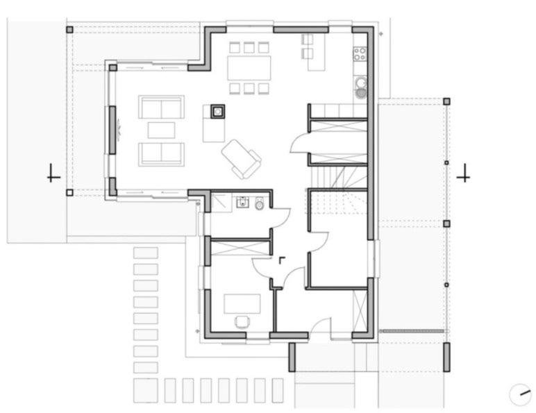 Dom jednorodzinny o powierzchni ok. 150m2, wykonany w technologii tradycyjnej murowanej z ciepłym fundamentem na płycie. Budynek ogrzewany jest niskotemperaturowym systemem ogrzewania podłogowego w połączeniu z pompom ciepła powietrze-woda oraz systemem wentylacji mechanicznej z odzyskiem ciepła. Dzięki zastosowanym rozwiązaniom technicznym oraz odpowiedniej aranżacji przestrzeni budynek jest wysoko energooszczędny Eu=40kWh/m2/rok). Budynek jest nowoczesny ale inspiracją przy jego projektowaniu były tradycyjne formy polskich dworów z wykuszami i przeszklonymi werandami od strony ogrodu i prostymi dwuspadowymi dachami. Dla wizualnego ocieplenia prostej formy i kontrastujących kolorów bieli elewacji i grafitowej dachówki, zastosowano okładziny elewacyjne z desek. Deski ponadto miały dawać skojarzenia bliskości naturze i bardziej sielskiego wymiaru podmiejskiej rezydencji. Bryła na etapie tworzenia przechodziła wiele modyfikacji stopniowo oddalając się od swojego pierwowzoru aby ostatecznie zaistnieć jako dom nowoczesny inspirowany tradycją. Budynek zlokalizowany będzie w Gdańsku w dzielnicy Karczemki.