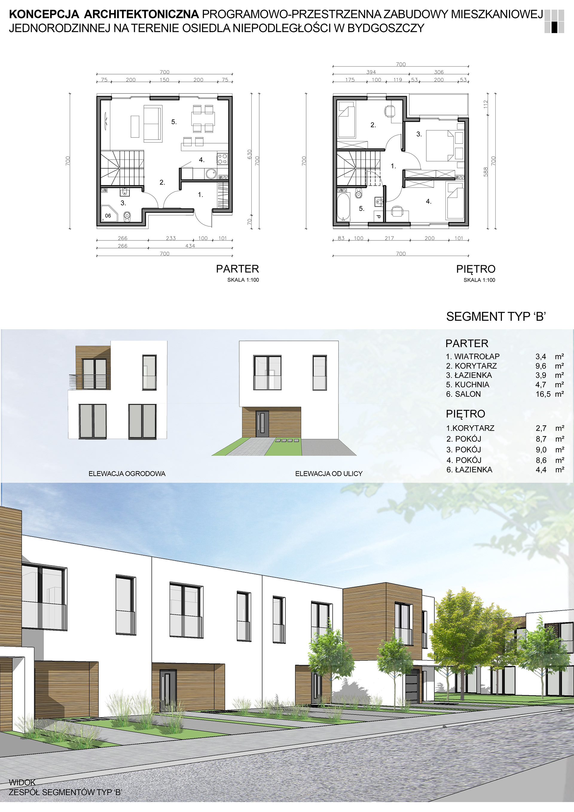 Projektuje się 46 segmentów zabudowy szeregowej usytuowanych na terenie objętym opracowaniem. Zaprojektowano trzy typy zabudowy szeregowej, mogącej się swobodnie przeplatać. Dzięki zastosowaniu palety naturalnych materiałów oraz spójnej koncepcji kształtowania elewacji, istnieje wiele możliwych kombinacji ostatecznego wyglądu osiedla, przy tym samym układzie komunikacyjnym. Istnieje możliwość wariantowości kształtowania elewacji, pozwala to na uzyskanie różnorodnej przestrzeni osiedla, zachowując przy tym spójność całego dla zamierzenia. Przedstawiony na